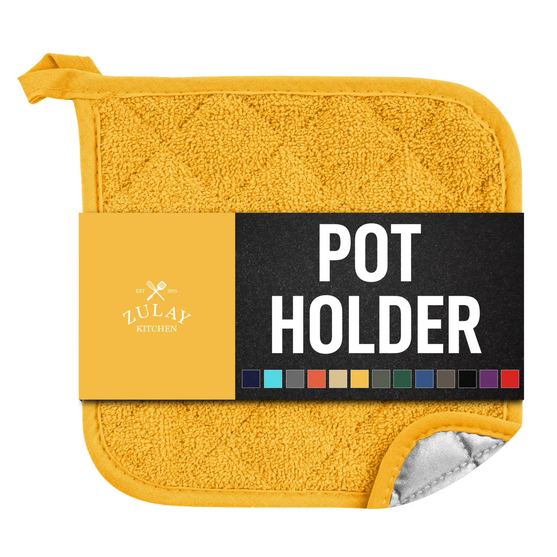 Upgrade your kitchenware with this chic cotton pot holders. Your pots and pans will always be safe from the burners with its heat-resistant quilted back lining! The bright sunshine yellow pattern adds a nice touch to your kitchen decor, making it an excellent addition to anyone's home.